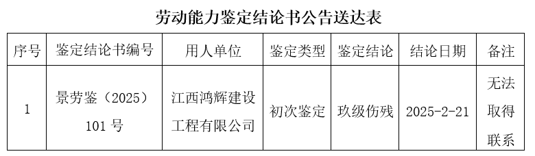 我委以邮寄送达方式送达劳动能力鉴定通知书,因在送达过程中,单位或个人拒收、地址变动或查无此人未能送达。现以公告形式送达,请下列被鉴定人、用人单位自本公告发布之日起三十日内到我委(景德镇市昌江区发展中心北苑29栋,景德镇市人力资源和社会保障局109室,联系电话0798-8516733)领取,逾期视为送达。