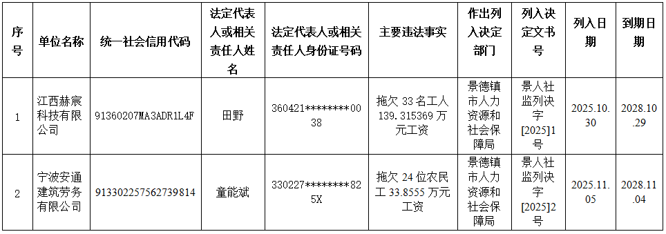 为加大对拖欠工资违法失信用人单位的惩戒力度,维护劳动者合法权益,根据《拖欠农民工工资失信联合惩戒对象名单管理暂行办法》(人社部令第45号)文件规定,现依法将拖欠农民工工资失信联合惩戒对象名单公示如下:
