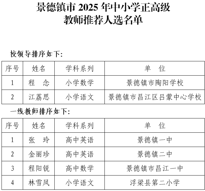 根据省教育厅、省人社厅《关于做好2025年度中小学教师职称申报工作的通知》及《关于印发江西省中小学教师职称评审办法的通知》(赣人社发〔2016〕15号)精神,景德镇市2025年中小学正高级教师推荐继续实行总量控制,需在下达的推荐名额内择优排序推荐。经过个人申报、组织推荐、无生试讲答辩、业绩量化、专家综合评议等程序,产生了景德镇市2025年中小学正高级教师拟推荐上报人选,现将人选名单予以公示,请社会各界进行监督。如有异议,可在2025年8月14日之前向景德镇市人力资源和社会保障局专业技术人员管理科或景德镇市教体局人事科书面提出,并签署真实姓名或加盖单位公章,以便核实与联系。市人社局专技科联系电话:0798-8502516;市教体局人事科联系电话:0798-8572088。