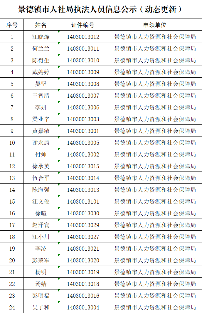 景德镇市人社局执法人员信息公示(动态更新)