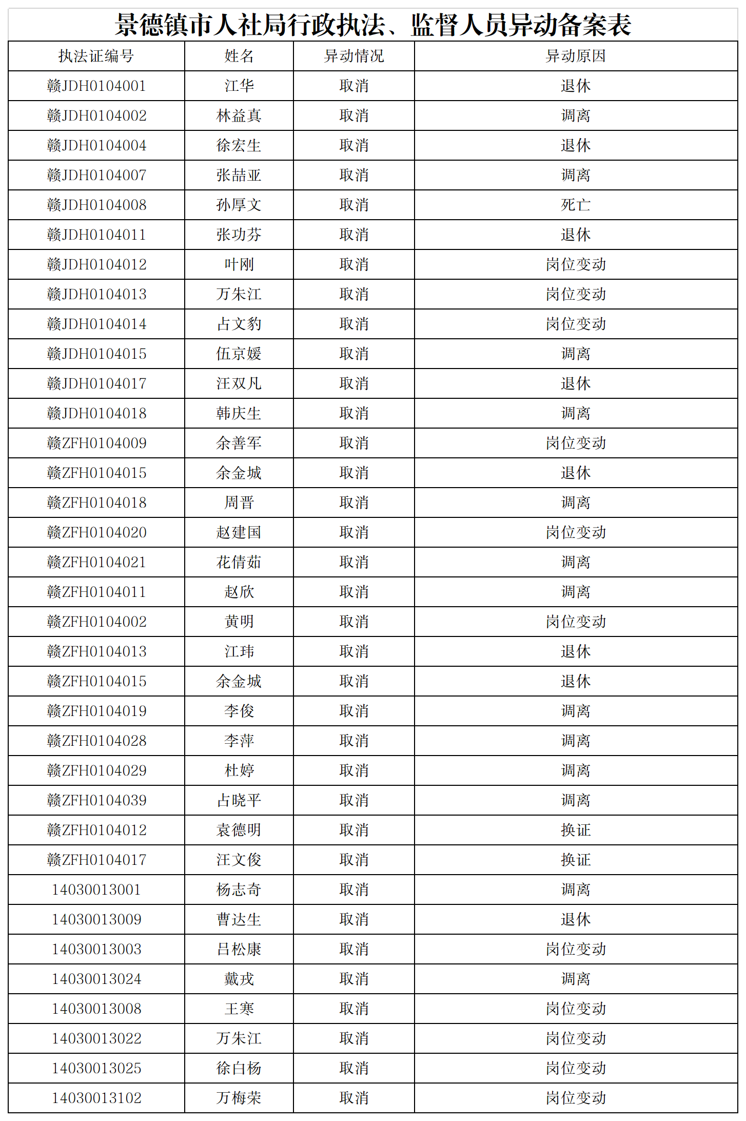 景德镇市人社局行政执法、监督人员异动备案表