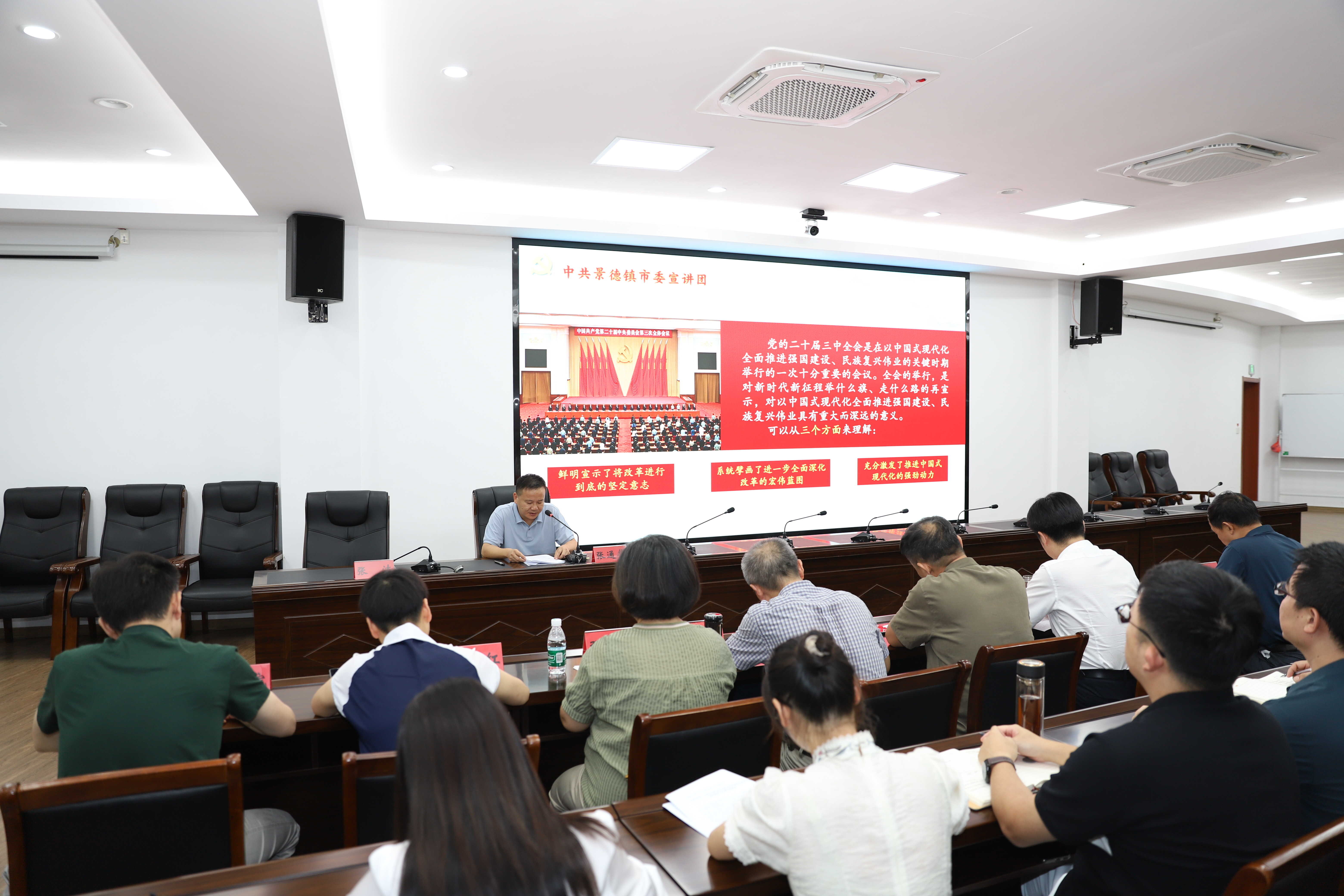 9月19日下午, 按照市委统一部署,学习贯彻党的二十届三中全会精神市委宣讲团报告会在我局举行。市委宣讲团成员、市委组织部副部长张通华作宣讲报告。市人社局党组成员、副局长张洁主持报告会,局机关及局属单位80余名党员干部参加会议。